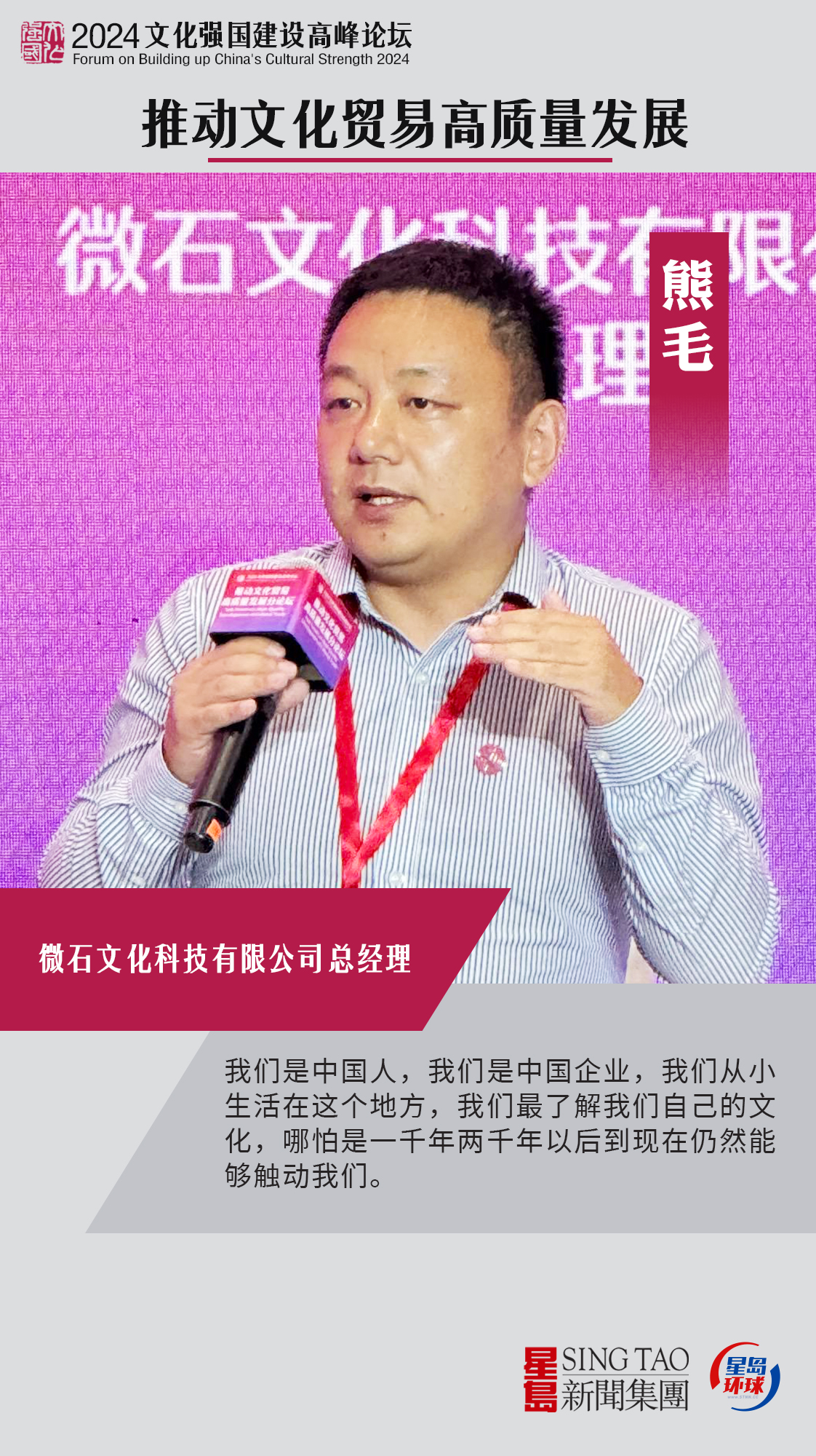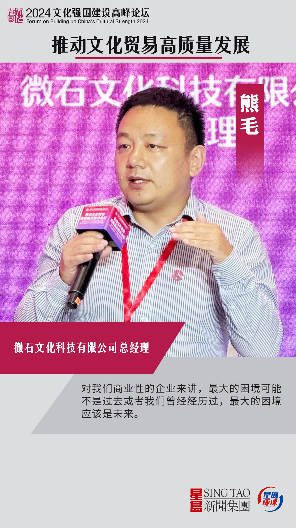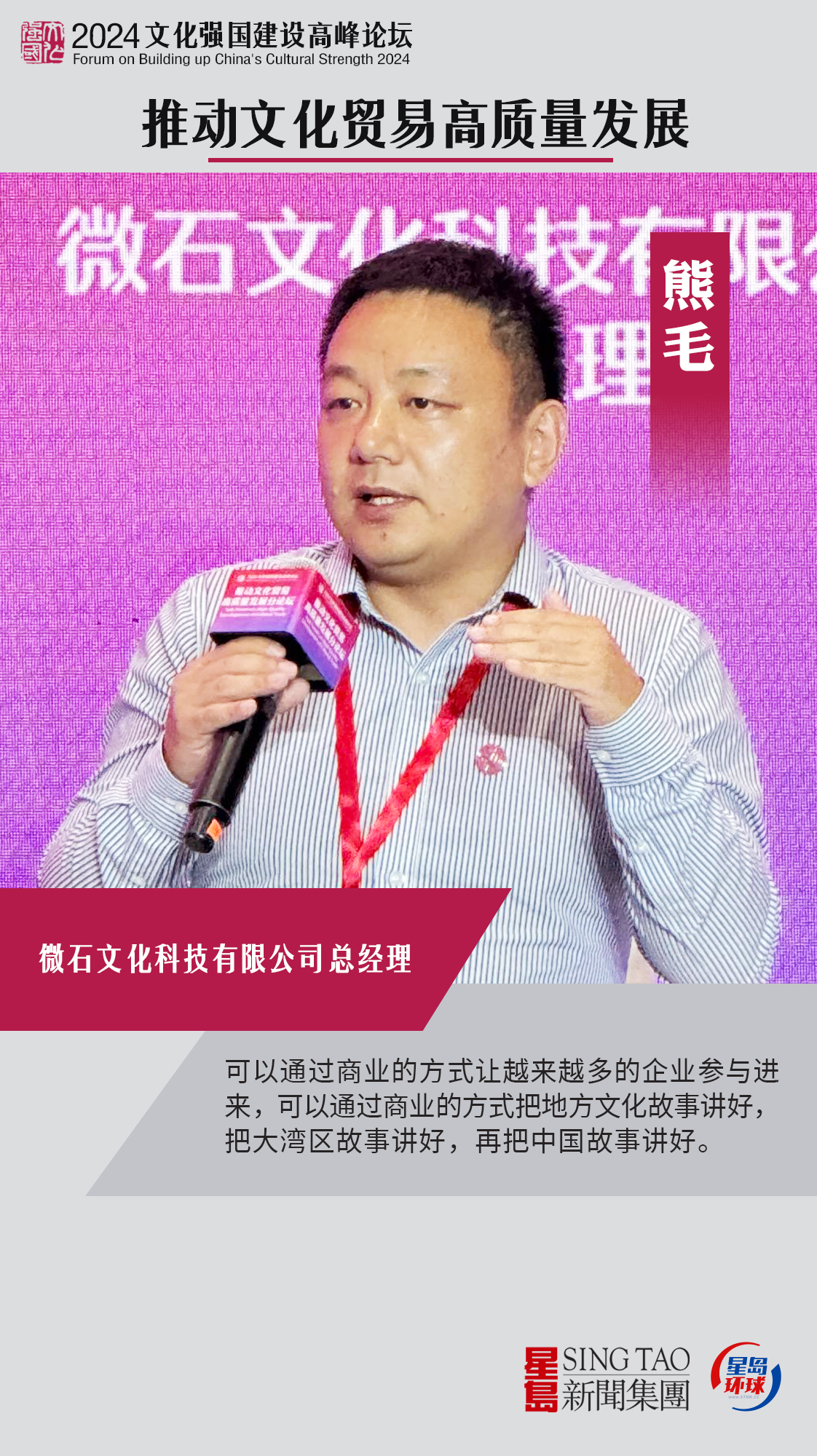 微石文化科技有限公司总经理熊毛表示,“我们是中国人,我们是中国企业,我们从小生活在这个地方,我们最了解我们自己的文化,哪怕是一千年两千年以后到现在仍然能够触动我们。”“对我们商业性的企业来讲,最大的困境可能不是过去或者我们曾经经历过,最大的困境应该是未来。”“可以通过商业的方式让越来越多的企业参与进来,可以通过商业的方式把地方文化故事讲好,把大湾区故事讲好,再把中国故事讲好。”