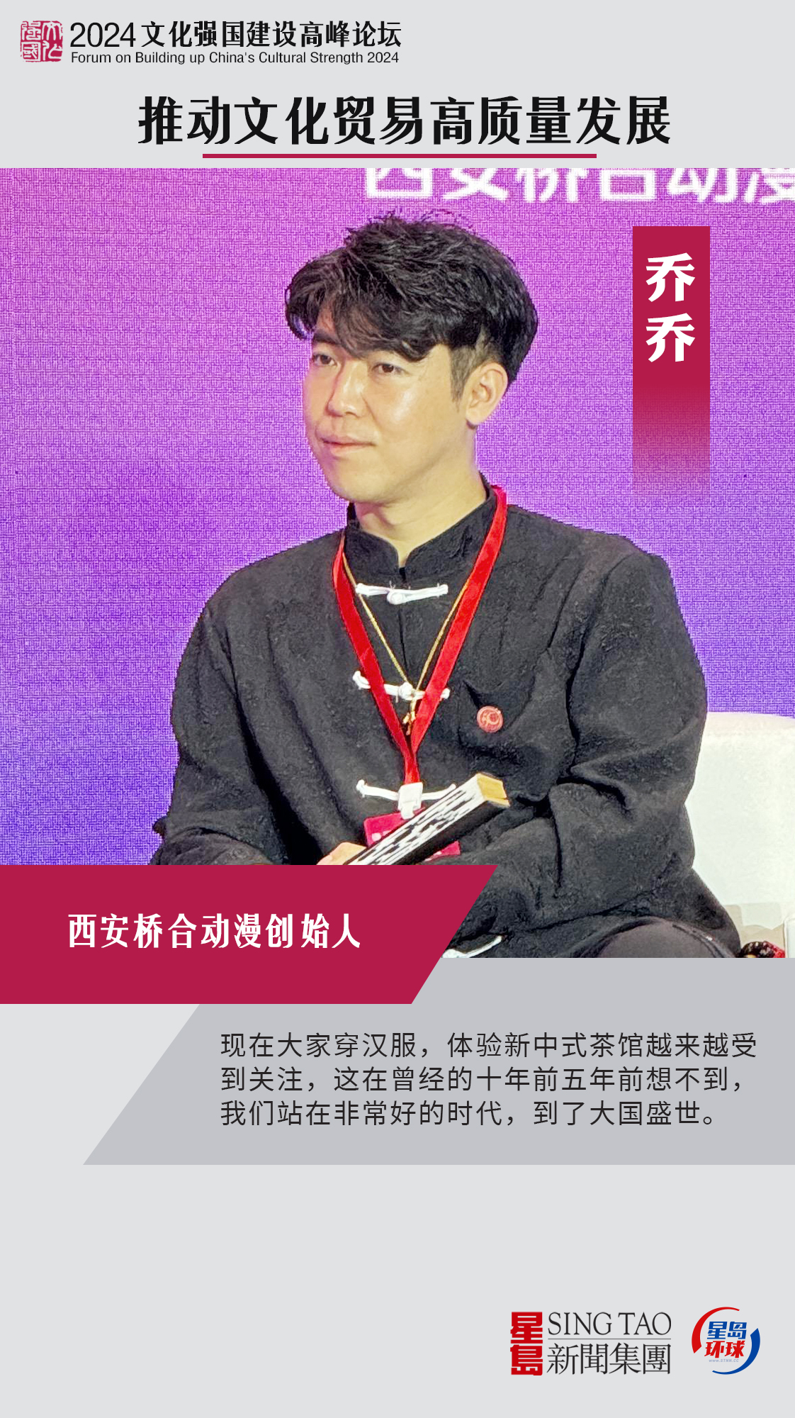 西安桥合动漫创始人乔乔表示,“现在大家穿汉服,体验新中式茶馆越来越受到关注,这在曾经的十年前五年前想不到,我们站在非常好的时代,到了大国盛世。”