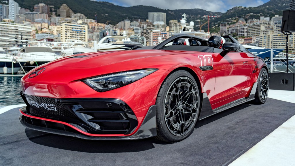 平治旗下Mercedes-AMG在本周末(5月25日及26日)F1摩纳哥蒙地卡罗站举行前夕,昨天(5月23日)在当地游艇会码头旁边搭建出一个别具意思的展示浮台,全球首发品牌旗下首款Mythos系列限量特制超跑PureSpeed,厂方还请来今届F1 AMG Petronas车队两位车手Lewis Hamilton及George Russell作揭幕礼嘉宾。厂方预期PureSpeed于2025年正式投产,全球限量仅250辆,并指明仅只会售予Mercedes-Benz忠实VIP爱好者及收藏家,至于新车售价则有待厂方随后公布。