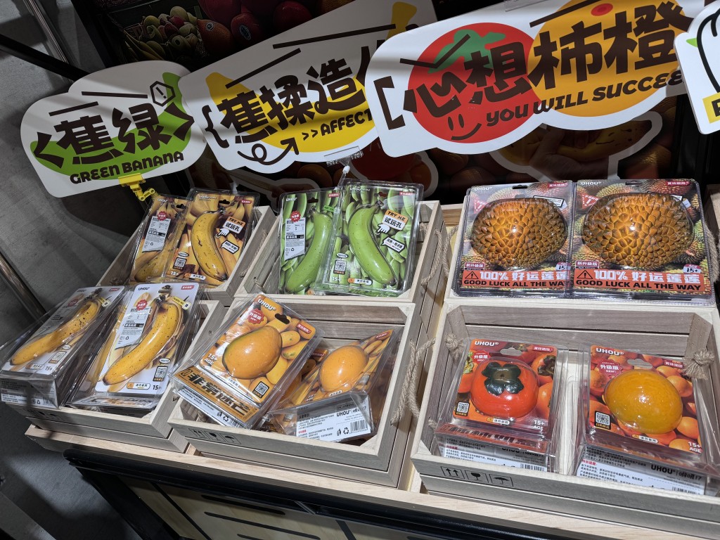 被“UHOU 哟吼”吸引进内的,必定是店中一个巨型“煎pan鸡蛋”装置 ! 店内还有一篮篮的红萝卜、大葱、香蕉、榴莲等,貌似一间蔬果店,实情所有食材,均是一件件软腍腍的减压玩具,可以随意搓圆㩒扁,抒发一日的工作压力,兼且玩味十足。