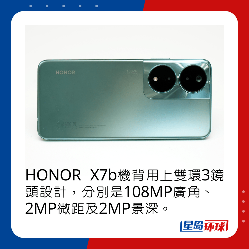 说到影拍,HONOR X7b跟大部分入门机款一样,除了广角主镜,另外2颗分别2MP微距及2MP景深,不过主镜还是用上1亿像素感光组件,且支持高像素模式直出108MP相片,同时提供2倍及10倍数码变焦,至于前置自拍为8MP。值得留意的是,此机不支持NFC,即不能用上Google Pay等感应式电子支付。