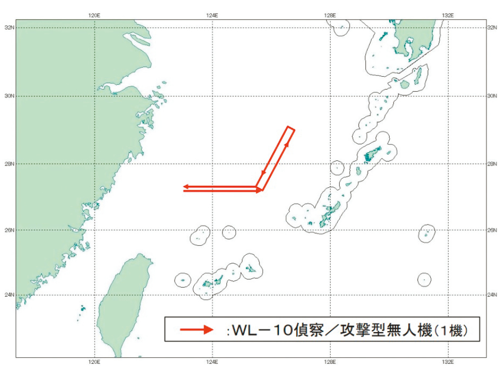 日本防卫省称,WL-10从中国大陆方向飞来,至少在东海绕飞两圈后返航。从防卫省公布航迹图来看,该无人机似乎是从中国的浙江出海,在钓鱼台北方空域飞行。日方在报道中所称的“WL-10”,从照片上看类似中国“翼龙-10”无人机,即解放军所称“无侦-10”(WZ-10)高空高速无人攻击机。