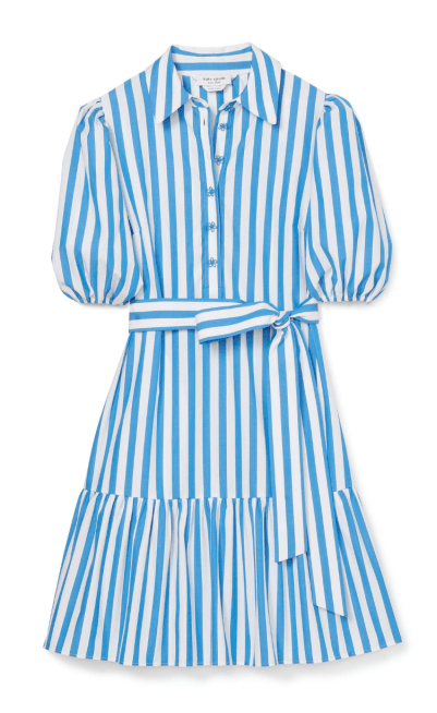 ▲kate spade newyork蓝白色条纹腰带连身裙/$3,380,配搭泡泡袖及百褶裙摆。