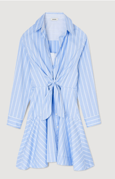 ▲Sandro蓝白色条纹恤衫连身裙/$2,990,采用绑结的设计,营造二合一错视效果。