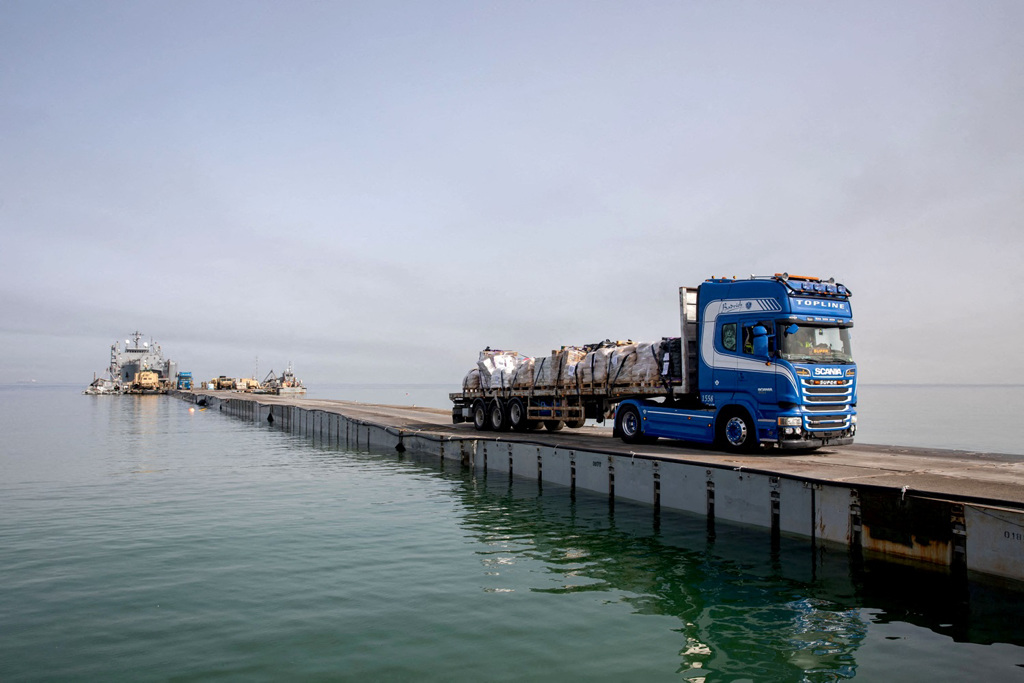 ▲画面为19日一辆货车载运救援物资通过加萨临时码头。(图/路透社、美军中央司令部提供)