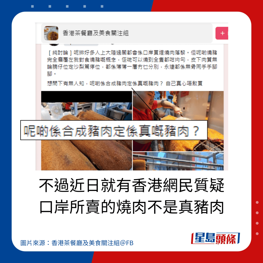 近日,却有造假疑云在香港网上讨论区传出。有香港网友质疑,口岸所卖的烧肉不是真猪肉。这位网友上载了数张内地关口附近烧味档的相片,从相片可见,深圳的售卖方式与香港一般的烧味档口不同。
