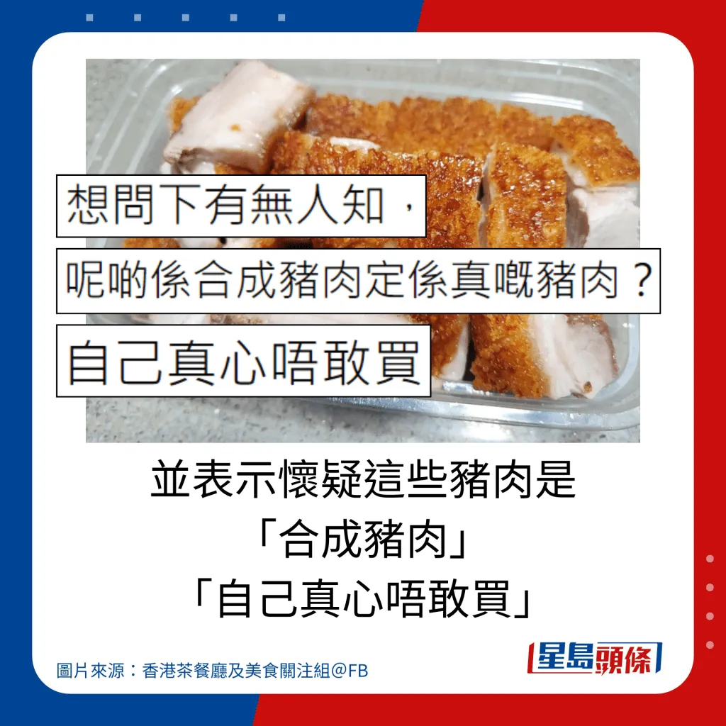 另外,网友亦质疑内地烧肉“没有骨头和手手脚脚”。网民大呻这些内地烧肉 “完全颠覆了我对食烧猪的概念”。并表示怀疑这些猪肉是合成猪肉,自己真心不敢买。