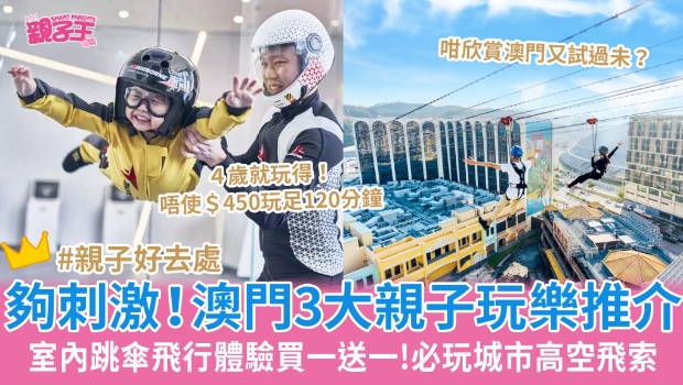 下星期就有3天端午假期,在这个长周末不如就带刚考试完毕的孩子去澳门玩番转,纾缓一下考试压力,释放紧张心情! 除了到各名胜古迹游览,或到室内游乐场放电,也可带孩子去试玩一些新奇刺激的玩意,就如室内跳伞体验及飞行训练,或是世界首个沉浸式城市高空飞索,即睇3大澳门亲子玩乐推介与优惠详情,即刻买飞出发。