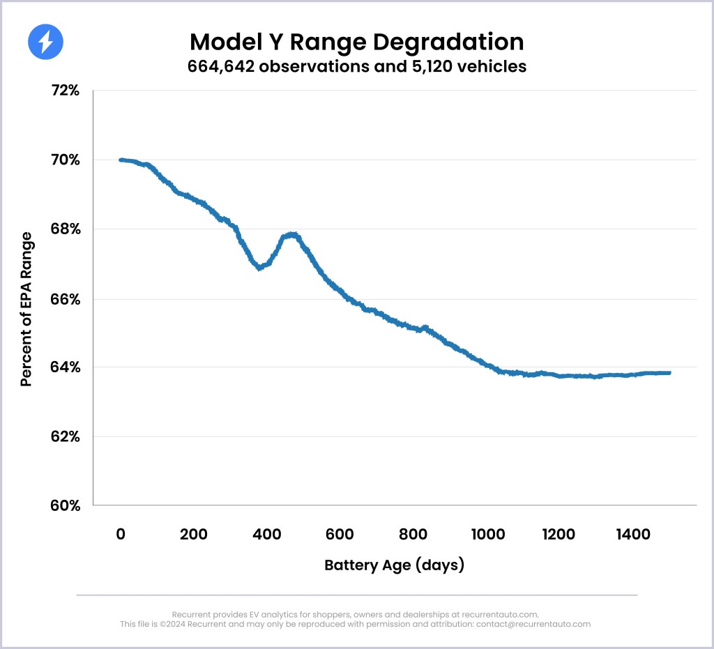▲Tesla Model Y也不例外,Recurrent Auto指新车电池只能达到官方EPA的70%。