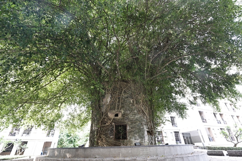 刘永福营盘碉堡遗址在校园内,为圆形,外围青砖灰砂。这里原本有两层木阁楼,但历经岁月洗礼,木阁楼已无存,墙外还长满了茂密的榕树,远远望去,就像一个大盆景。