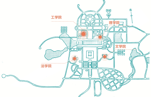 五大学院的空间布局也很有讲究。农学院位于钟的顶部,体现中国“以农为本”的理念,其他学院则在中轴线两侧对称布置,文学院和理学院居东,法学院和工学院在西。据说,这是体现了中国古代“左文右武”的传统礼制。从南向北,理学院、工学院居中,寓意国之臂膀;文学院、法学院在南端,与外界最接近,则寓意密切联系和服务社会。