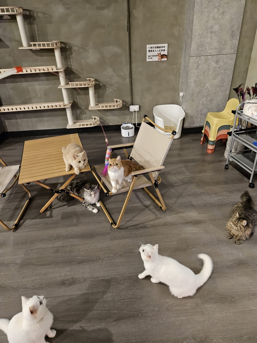 位于观塘的全新猫猫互动体验馆“KellyandMeows”占地过千呎,以露营风为装潢主题,环境宽敞,在这里生活的20多只小猫有足够的空间走动。体验馆跟一般猫café不同,这里不会有餐牌,不会提供主食,只有自助水吧提供饮品。