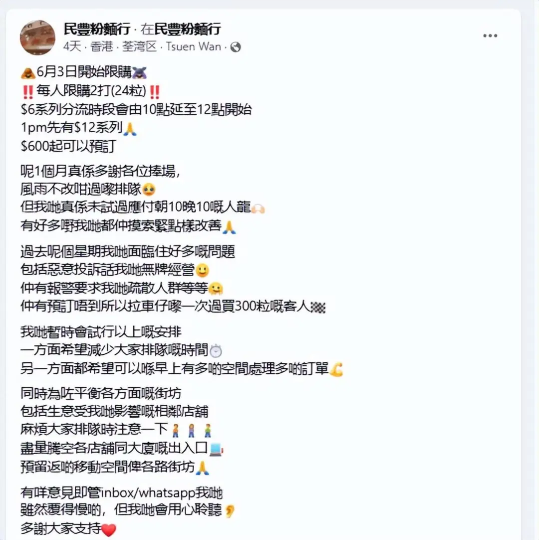 民丰粉面行在社交平台上更表示,曾有客人因为预订不到,而选择拉车子到店一次性买300粒糯米滋,进一步增加其他客人排队的时间。更有被恶意投诉“无牌经营”、报警要求疏散人群等。
