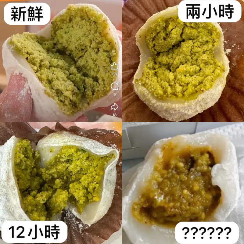 糯米糍外皮软糯,但摆放时间越久,就越有可能导致出水的问题。外皮出水后会变硬,而水分也会导致干爽的內馅变湿,影响口感。因此店家提醒,尽量不要放过夜,也不要放冰箱。