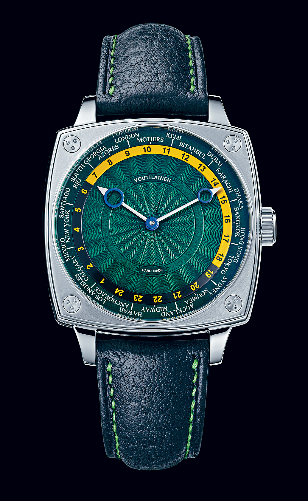 今次Voutilainen捐出的孤品是CSW Only Watch,当然是以表盘的手工机刻饰纹及颜色为卖点。CSW代表“Cushion Shape Worldtime”枕形世界时间,直接地道出腕表的造型及功能。设计最瞩目的除了是绿色表盘从中心向外散射、逐渐由尖锐变成弧形的独特放射纹,还有表底百看不厌的手工及特大摆轮的运作。
