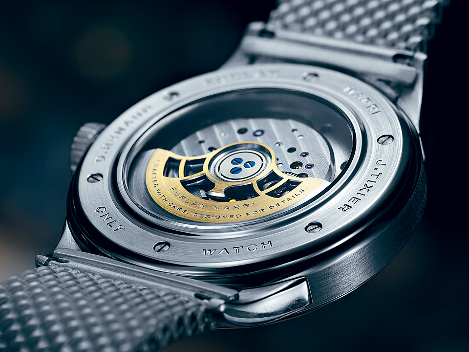 Chronometre d'Observatoire表面上是Petermann Bedat和Auffret Paris两个新进独立制表品牌合推的腕表,但前者其实是由Ga l Petermann和Florian Bedat两位制表师共同创办,连同创立Auffret Paris的Theo Auffret,实情是三人行的成果。这枚以Zenith 135古董机芯改装的小三针,拥有天文台级的精准度,除了耐看的简洁表盘,表底亦看到经碳化处理的机芯夹板所呈现的独特纹理。