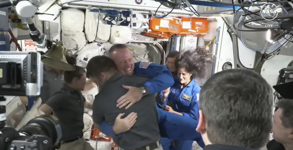▲威尔莫尔和威廉斯进入国际太空站,受到站内太空人拥抱欢迎。美联社