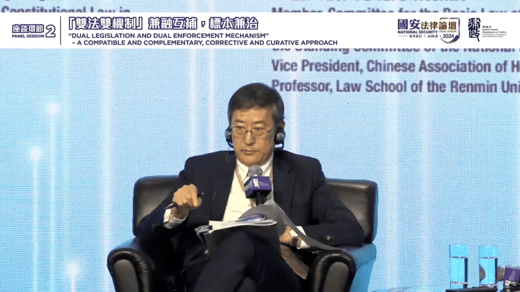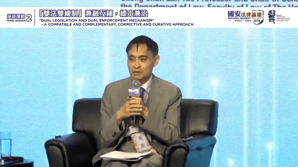 ▲陈弘毅进一步解释双法如何在程序和技术上的细节中互相补充。 国安法律论坛直播截图