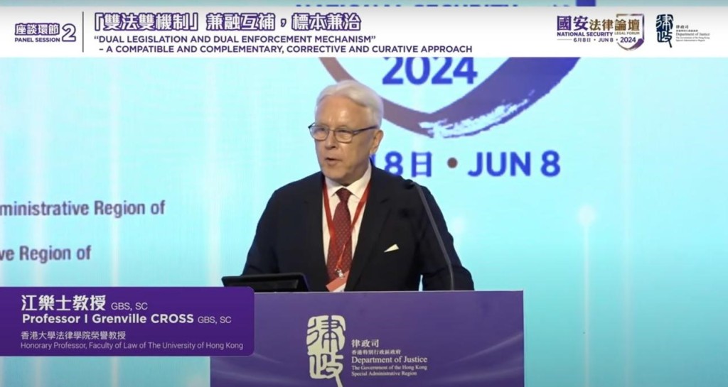▲江乐士表示,《维护国家安全条例》与普通法世界的其他地方一样。 国安法律论坛直播截图