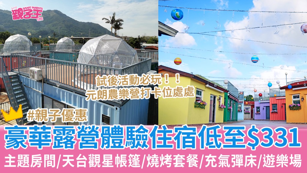 终于考完试,想跟小朋友放松一下,不如就跟小朋友去Glamping,放下手机电玩,晚上可齐齐观星,也可玩露营场的多个游乐设施,尽情放电! 备受家长欢迎的元朗农乐营豪华露营体验住宿低至每位$331,即可入住热门主题小屋,有天台可观星! 更有小朋友最爱的儿童游乐室、迷你赛车场,还包烧烤餐饮券,即看露营体验优惠详情及快抢链接,跟孩子去打卡放电亲子乐!