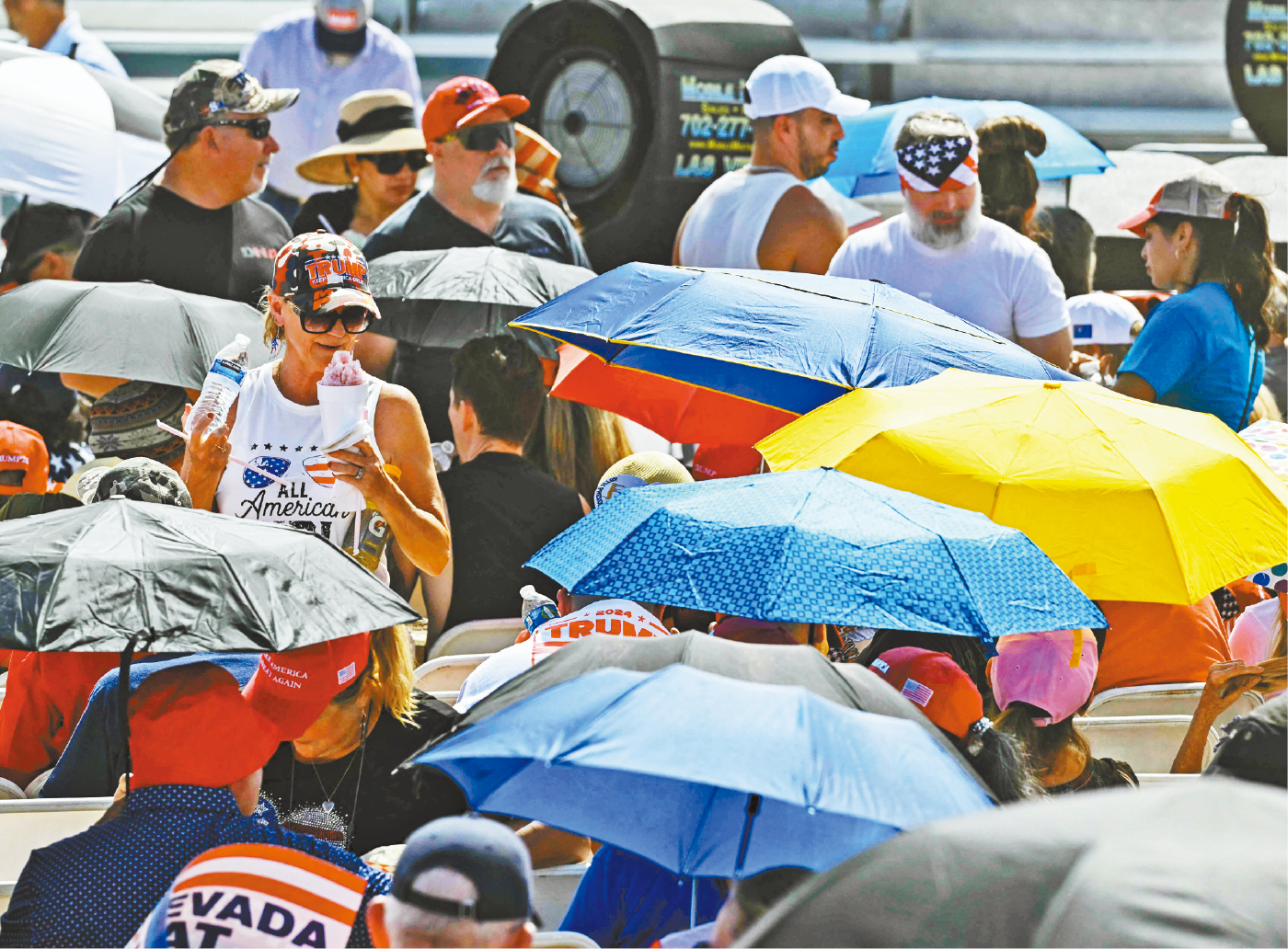 ▲拉斯维加斯的集会地点几乎没有树荫,特朗普团队做足准备以防现场有人中暑,安排额外的医护人手、风扇与食水,并允许支持者携伞。 法新社