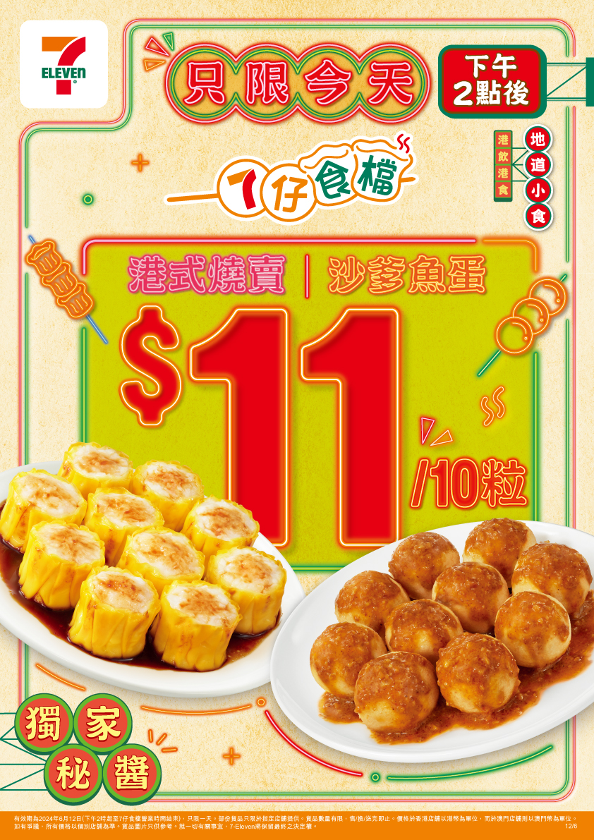 7-Eleven于6月12日再度推出快闪一天的限时激抵优惠,由下午2时起至店铺7仔食档营业时间结束,可以$11的优惠价购买“7仔食档”的地道小食,包括鱼蛋或港式烧卖10粒,鱼蛋配以7-11独家配方的秘炒沙爹酱,炸蒜与花生够香浓,而烧卖则可搭配葱香豉油及秘制有渣辣椒油,同样惹味。