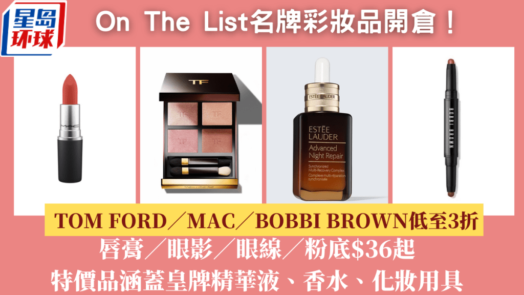 OnTheList名牌彩妆护肤品开仓优惠3折起! 由即日起至6月19日,OnTheList购物平台网站推出TOM FORD、Estée Lauder、MAC、BOBBI BROWN等化妆及护肤品开仓大减价,眼影、粉底、唇膏,以至护肤精华液、化妆用具低至$36,大受女生欢迎的Estée Lauder Advanced Night Repair精华液4折后只售$579,记得留意优惠详情入手!