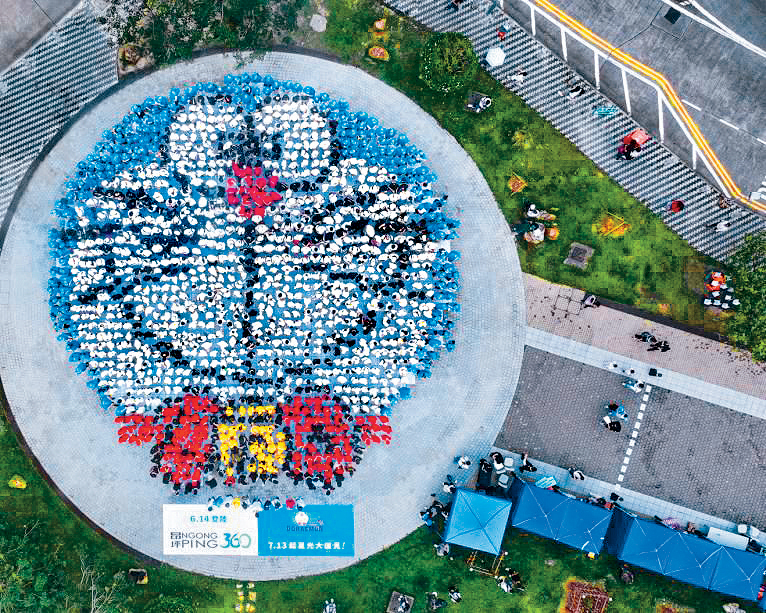 ▲近1,500名学生和义工穿上多啦A梦主题颜色的衣服和帽子,有序排列拼出展览主题多啦A梦头像。