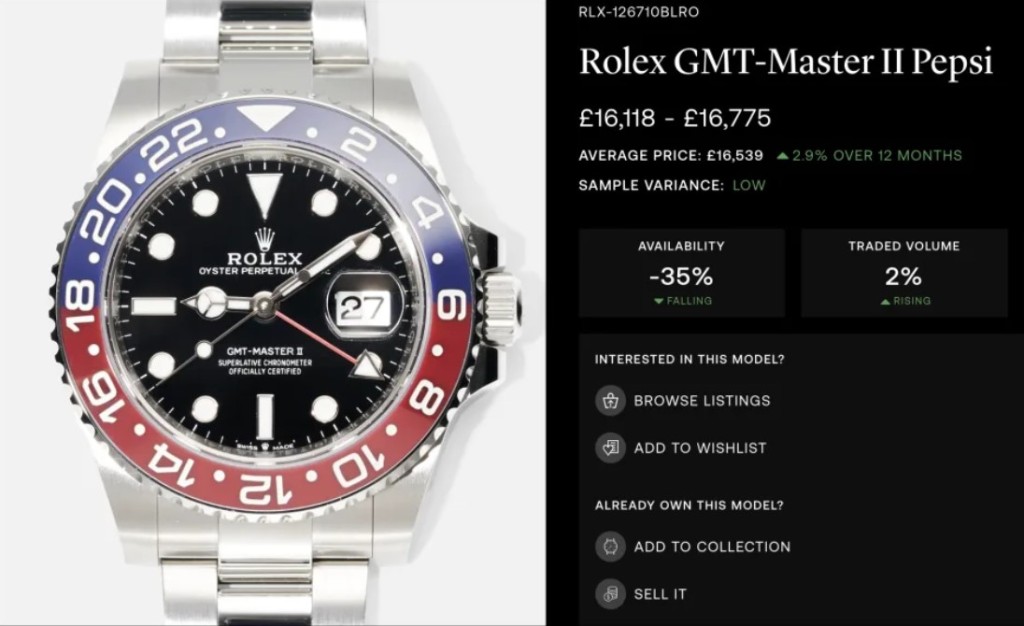 Subdial数据显示,“百事圏”GMT-Master II二手价格在过去一年上升4.1%,达到约 2.1万美元,几乎是零售价的一倍。相比之下,蓝黑Batman圈的GMT-Master II的受欢迎程度不及百事圈,其二手价格下跌10.1%至约1.6万美元。