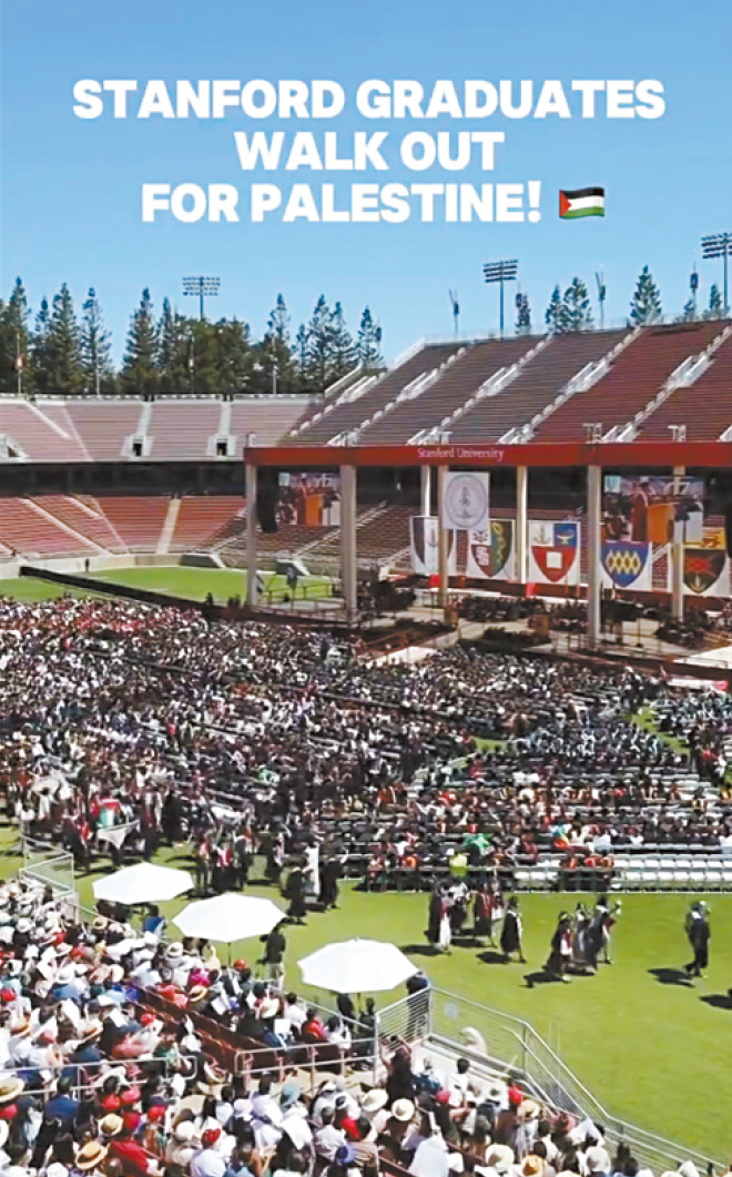 史丹福大学16日进行第133届毕业典礼,有5,400多名应届毕业生出席,期间出现挺巴示威,数百名学生离场抗议,表达对巴勒斯坦的支持。