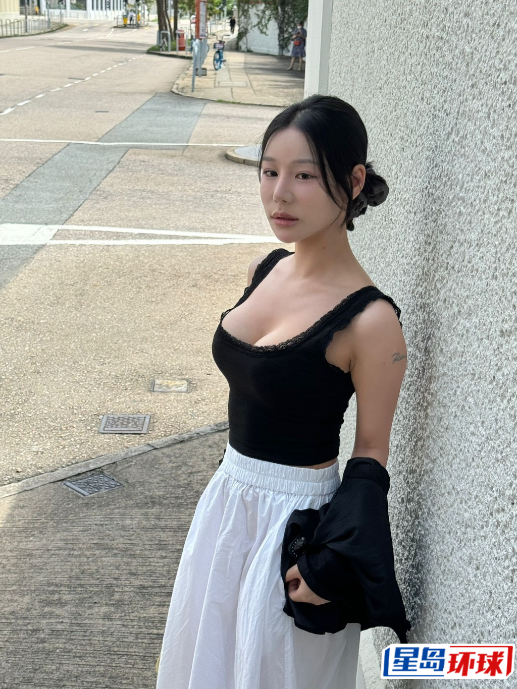 另一位以黑色小背心,加白色长裙出场的佳丽,手上面有纹身,未有透露名字,原本她穿着黑色外套,但一除外套就见到里面她细一码的小背心,尽显其夸张身材。