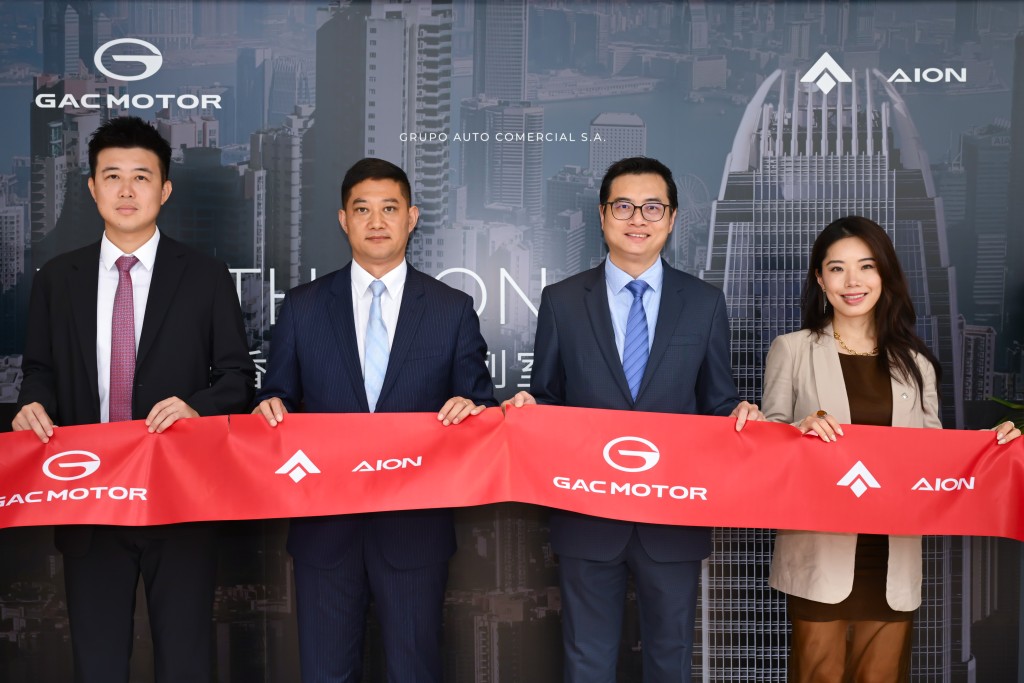 ▲国产电动车广汽埃安AION沙田新店开幕,香港埃安总经理张振国(右二)主持剪彩仪式。