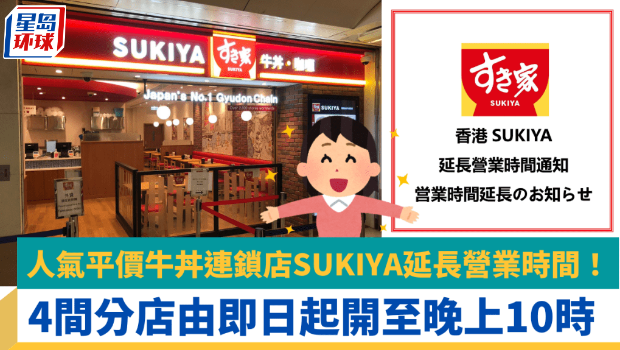 日本牛肉饭连锁店SUKIYA(すき家)于2019年在香港开设首间分店,以优惠的价格吸引大量市民光顾。近日,SUKIYA宣佈,4间分店将会延长营业时间,包括位于鰂鱼涌的AEON Kornhill店、乐富的Lok Fu Place店、宝琳的Metro City店将会延长至晚上10时;而调景岭的Choi Ming Shopping Centre店,则会延长至晚上11时。
