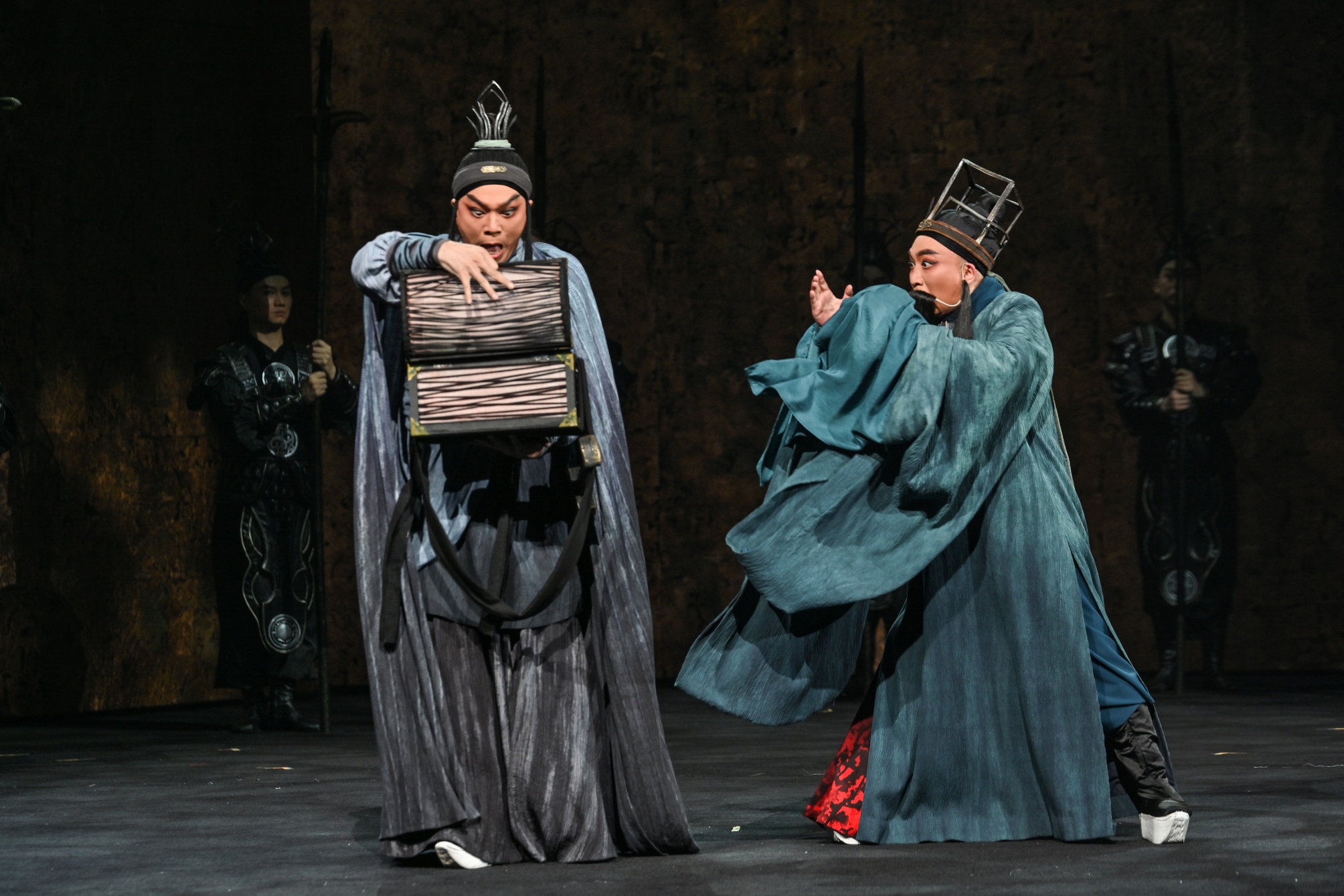粤剧《程婴救孤》的舞台气势恢宏,将简约的感性和灵动的气韵以连贯重组的方式组合起来。它不仅承载了剧目的整体舞美样式,赋予了戏曲空间的持续性和扩展性,为人物的扮相作铺陈,也间接地触发了观众的无限思考。