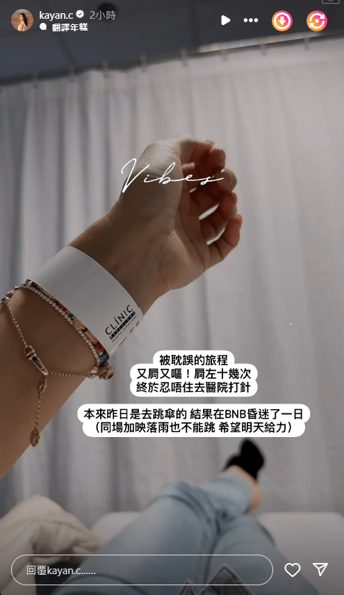 富贵人妻蔡嘉欣今日在IG的限时动态连发三帖,她先贴出入医院打针照,并写上:“被耽误的旅程,又疴又呕! 疴咗十几次,终于忍唔住去医院打针,本来昨日是去跳伞的,结果在BNB昏迷了一日(同场加映落雨也不能跳,希望明天给力)。” 照片可见蔡嘉欣躺在病床上,手系上入院纸环。 之后她转发了好友的限时动态,并写上:“复活了,本来今朝仲以为出唔到去要喺屋企揽住个厕所”,她亦透露原来他们同行的人都一齐食物中毒。 及后她贴上行街影片,写上:“虽然仲是无胃口,但顶硬上! 希望我不要再肚疴吧!“。