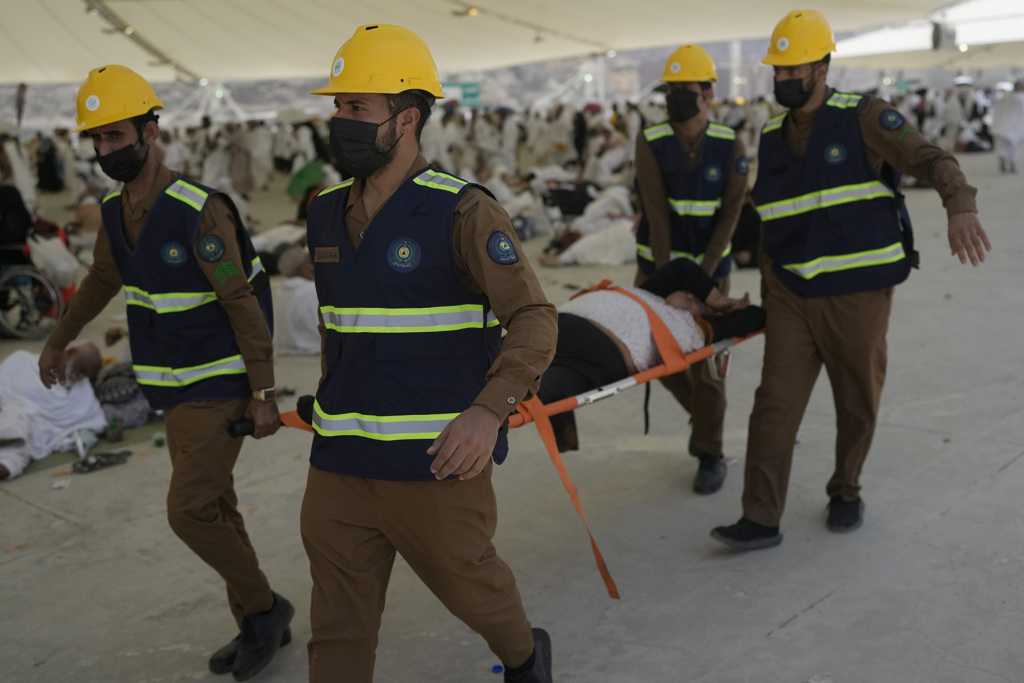 ▲麦加大批朝觐穆斯林之中,不乏有人因高温不支倒地,只能等待专人抬离现场。美联社