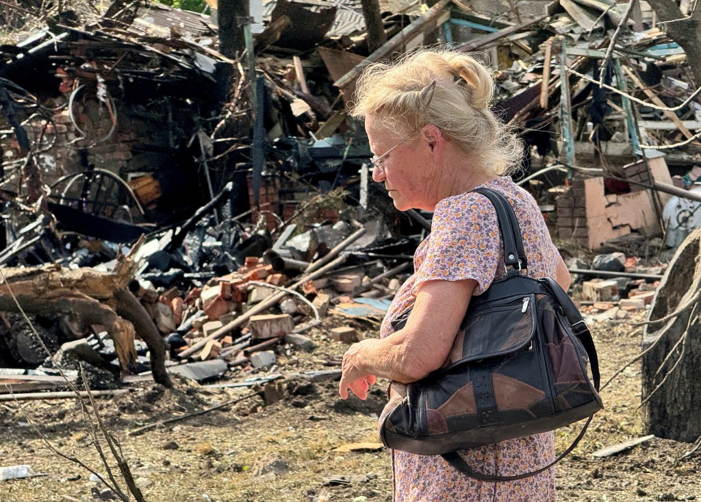 ▲一名乌克兰妇人在被毁民宅前。 路透社