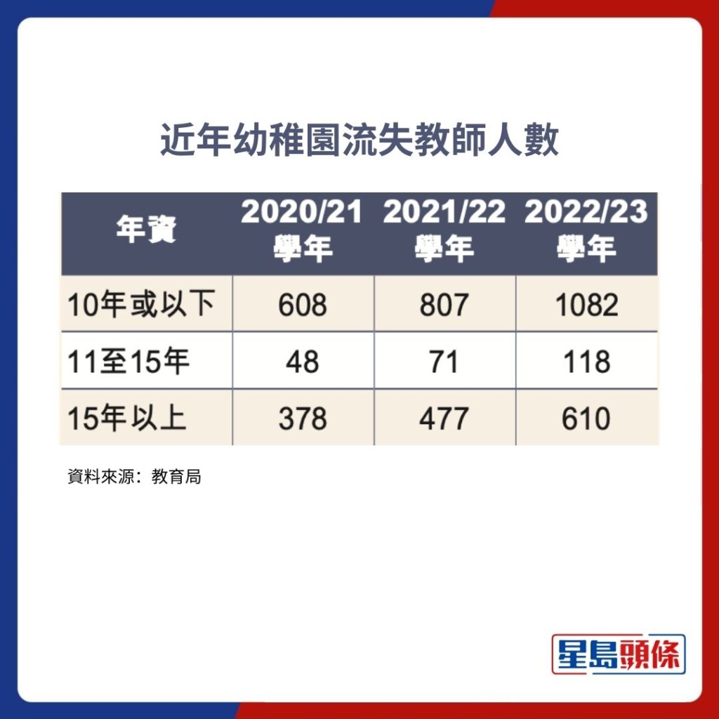 幼儿园收生不足,幼儿园教师流失同样严重,已连续3个学年出现流失。 据教育局资料,2022/23学年共流失1810名幼儿园教师,较前一年上升33.6%,同期新聘请教师只有1039人,未能弥补空缺,而教师流失原因包括退休、转校及转行等。 有不愿具名的幼儿园校长指,近年多了教师离职,亦与课程改革,加重教师工作量与压力有关。 他不讳言,难以掌握未来数年的离职人数,忧虑幼儿园结业潮氛围下,幼儿园教师工作前景欠佳,难吸引青年报读,形成报读人数减少的恶性循环。