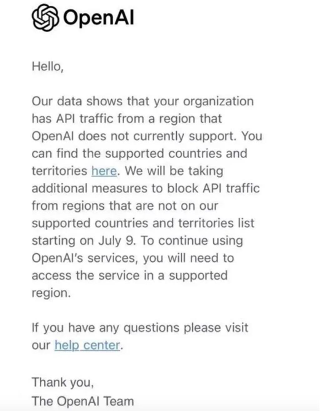 据《证券时报》报导,从24日晚间至25日,已有多名用户收到了来自OpenAI的邮件。该邮件表示,“我们的数据显示,您的组织来自OpenAI目前不支持的地区的API流量。”邮件进一步表示,自7月9日起,OpenAI将开始阻止来自非支持国家和地区的API流量。受影响组织若希望继续使用OpenAI的服务,必须在其支持的国家或地区内访问。
