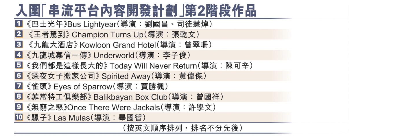 电影发展基金去年推出“串流平台内容开发计划”(见表),以比赛形式招募参赛团队,开发于串流平台播放的剧集,希望培养出用国际视野创作、制作和推广电影内容的团队,为香港创作内容开拓新市场。入围计划第二阶段的导演曾翠珊指,过去也有参与串流平台制作的经验,这次则是首次开发原创剧集,“希望藉此计划的资源,有足够的空间去创作一部既有本土元素,又富国际视野的作品。”她直言,政府推出项目必定有帮助,如计划为各个参加者安排国际知名的编剧顾问,“我们都期待和不同地域的创作人交流。”