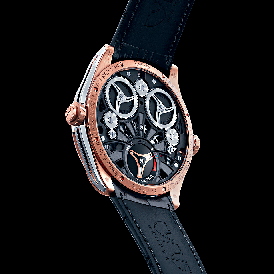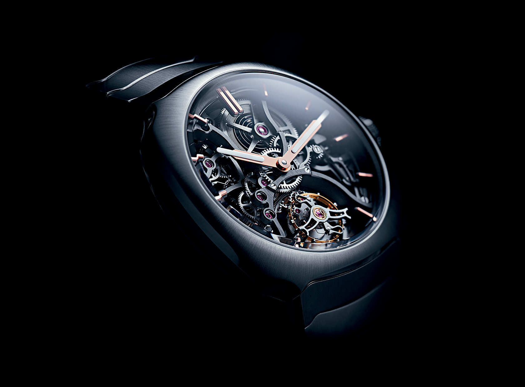 今年首次以圆形亮相的全新Etheral系列,虽然并非经典Klepcys的方枕造型,但粗身的表耳、表壳两边的弧形线条、左右两边设置双表冠,以及创新的复杂功能,依然一眼便看出是品牌出品,甚至是出自制表大师Jean-Francois Mojon手笔,辨识度极高。花了六年时间研发,腕表拥有轨道式双飞行陀飞轮,两个立体的陀飞轮能自转亦能围绕表盘以一小时一圈的速度旋转。以双转碟构成的跳时显示更可在任何时间保持水平显示。位于3点位的表冠用作上链和调校时间,9点位则用于快调小时显示。