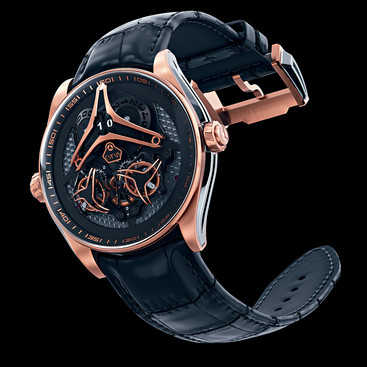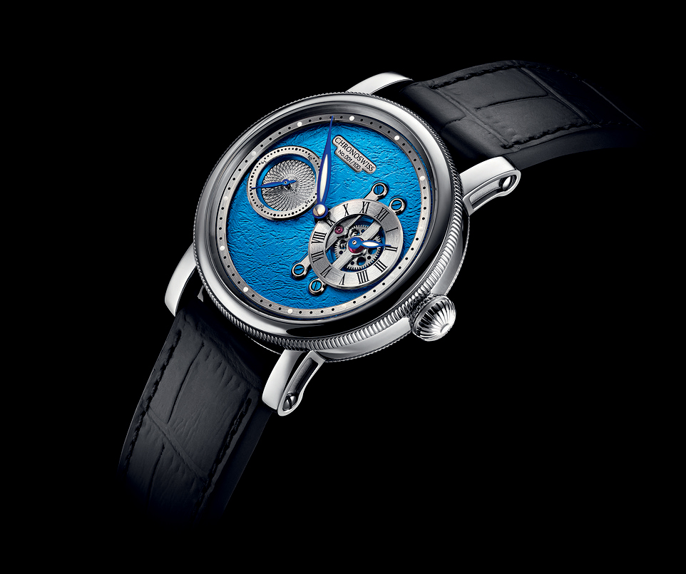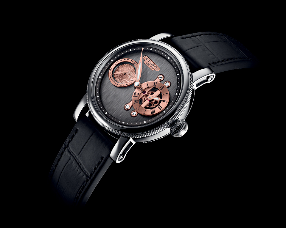 Chronoswiss最著名的表款是时针、分针和秒针均独立分三个不同轴心运行的Regulator,此设计源于航海钟用于校对时间的腕表,中文名称为规范式腕表或“三针一线”,因12点时三支针会连成一直线。Regulator的指针一般是垂直排列,时、分及小秒针分别设于12点、表盘中心及6点位。备有蓝色H2O及深灰Golden Gear的全新Strike Two改以水平排列,分针仍设于表盘中心,但时针和小秒针分别设于3点和9点,时针盘更以双搭桥配镂空设计,小秒针盘有手工机刻饰纹,表盘饰以垂直拉线或压纹装饰。