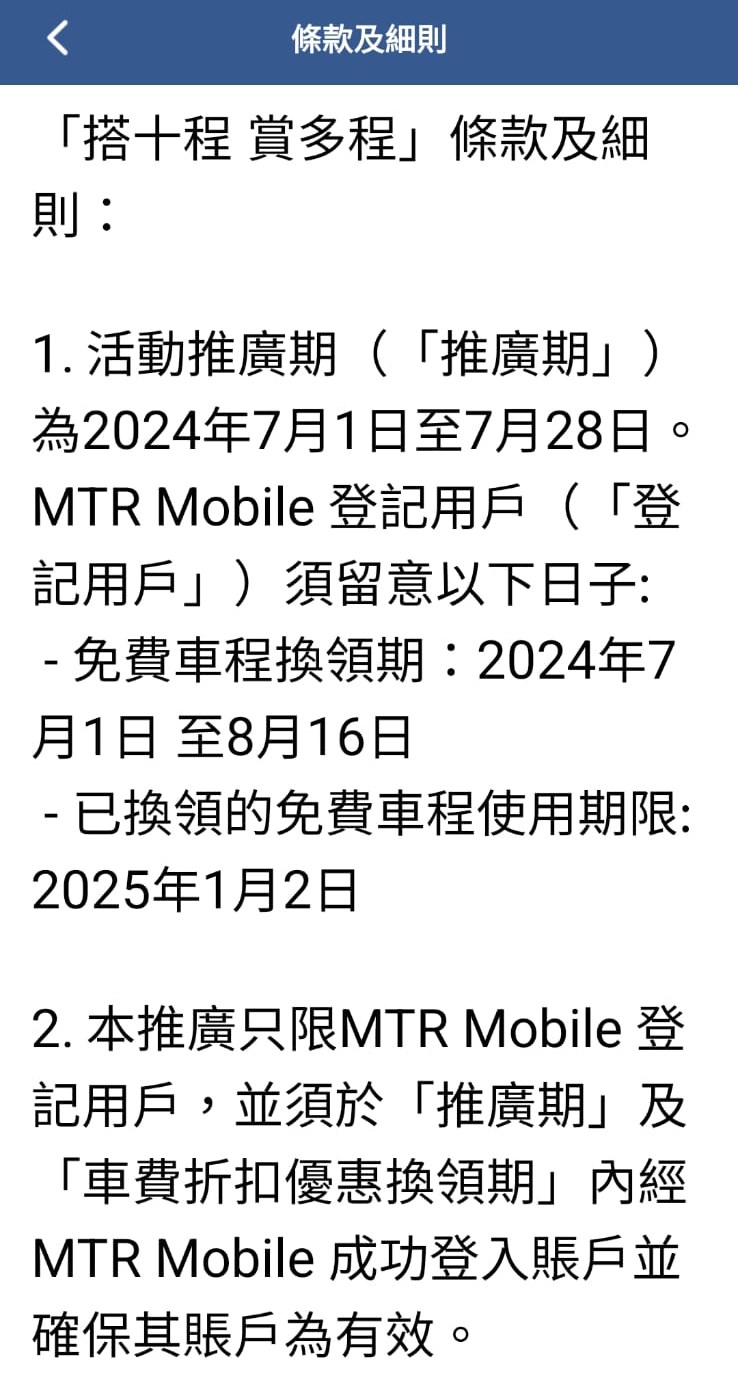 ▲港铁搭十送一——“搭十程 赏多程”优惠下,免费本地单程车程条款及细则。港铁网页截图