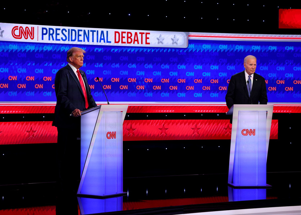 ▲美国现任总统拜登27日和前任总统特朗普在亚特兰大举行首场大选电视辩论。(路透)