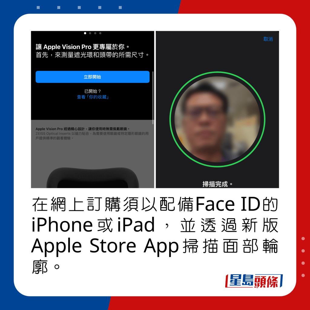Vision Pro现可于Apple Store门市或网站直接订购,要有最贴身舒适的佩戴体验,遮光环及头带尺寸均要非常准确,故在网上订购,需要利用配备Face ID的iPhone或iPad,以及最新版本《Apple Store》App,完成面部扫描; 如前往门市,Apple Specialist会协助阁下完成类似扫描程序,由系统决定判断最合适的尺码。 如有矫视需要,好像近视或老花,果粉可额外购买ZEISS Optical Inserts镜片,网上订购的话要预先提供度数信息,店内则可以直接量度所佩戴的眼镜度数。 成功入手Vision Pro后,Apple会提供一个免费网上环节,让用户进一步了解装置本身、佩戴调校及操作visionOS。