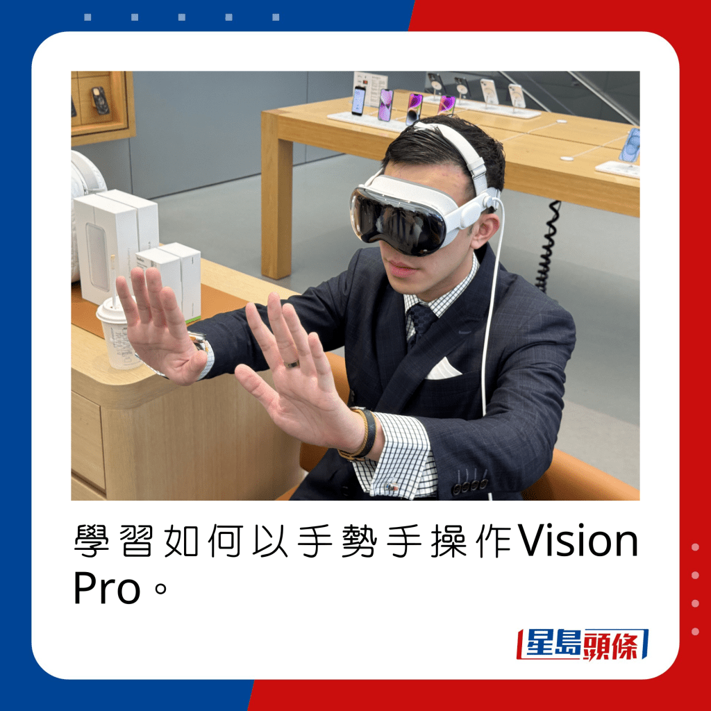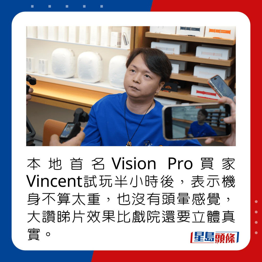 ▲本地首名Vision Pro买家Vincent试玩半小时后,表示机身不算太重,也没有头晕感觉,大赞睇片效果比戏院还要立体真实。