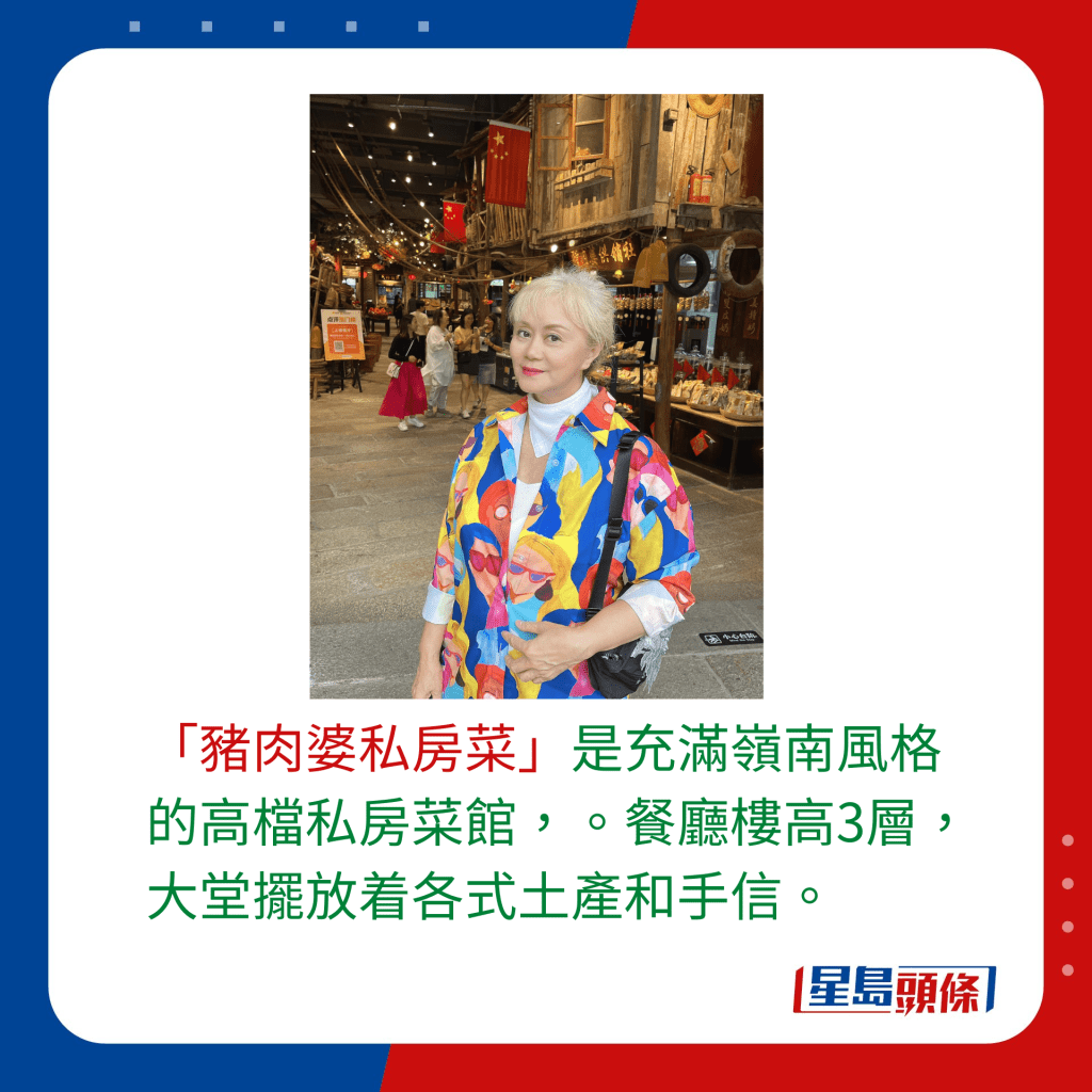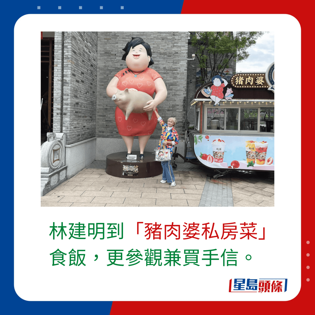 林建明光顾的“猪肉婆私房菜”在顺德无人不识,位于园区内的23幢,店内以青砖白瓦、亭台流水,充满岭南风格做设计,餐厅楼高3层,大堂摆放各式土产和手信,门外更见到有“猪肉婆芬姐”的巨型人像供打卡之用。