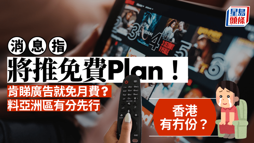 Netflix传推出免费方案!Netflix是不少港人观看电影和剧集的首选串流平台,据外媒消息指,Netflix目前正计划推出“免费订阅(含广告)”服务,代表用户可以免费使用Netflix平台,惟需不定时观看广告,适用地区更有可能包括香港?