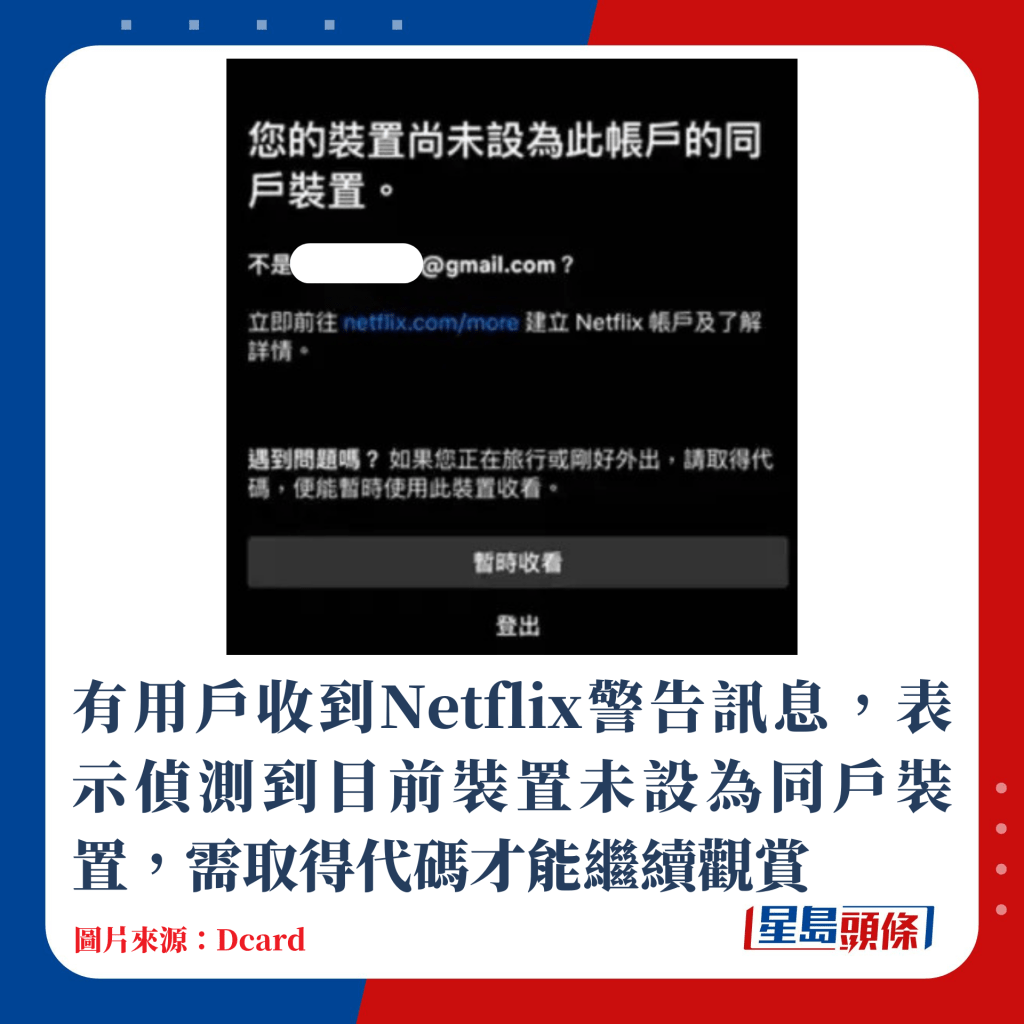 ▲有用户收到Netflix警告讯息,表示侦测到目前装置未设为同户装置,需取得代码才能继续观赏