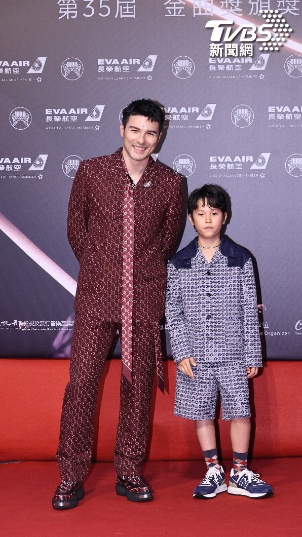 台剧男星凤小岳去年转战歌坛,以首张创作专辑《柒》入围最佳新人奖、最佳专辑制作人奖和最佳作词人奖,和8岁儿子“小木耳”一起穿上GUCCI老花套装现身,儿子遗传到他的神基因,成为红地毡最型父子档。